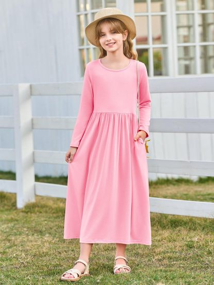 Haloumoning Girls Maxi Dress Long Sleeve Casual Holiday Dress with Pockets for 5-14 Years